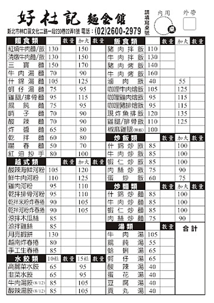 好杜記官網有完整菜單:https://chinese-noodle-restaurant-426.business.site/
